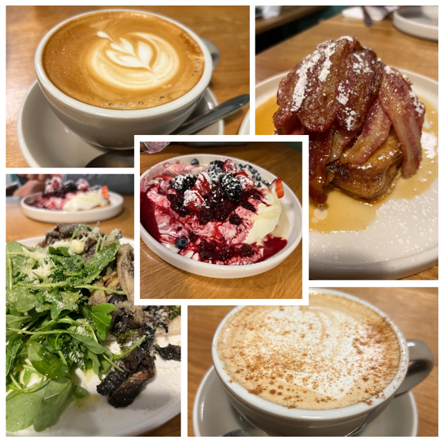 Lovely. Delicious. This café is quaint, has ample indoor seating and a few tables streetside. We tried mushroom bread, bacon French toast (voted the winner by all of us) and a specialty berry compote pancake. It was a great place to land following the long flight and refuel.